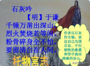古文诗:千锤万凿出深山,烈火焚烧若等闲。粉骨碎身浑不怕,要留清白在人间。 2.翻译:石灰石只有经过千万次锤打才能从深山里开采出来。它把熊熊烈火的焚烧当作 很平常的一件事,即使粉身碎骨也毫不惧怕,甘愿把一身清白留在人世间。 3.这是一首托物言志诗,若只是事物的机械实录而不寄寓作者的深意,那就没有多大价 值。这首诗的价值就在于处处以石灰自喻,咏石灰即是咏自己磊落的襟怀和崇 高的人格。
